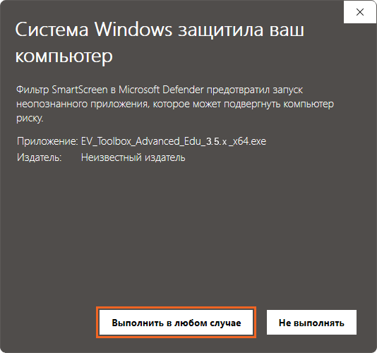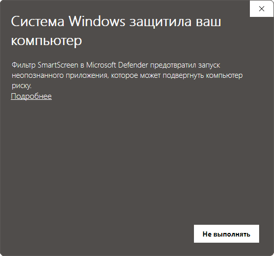 При установке программы на ОС Windows Защитник Windows покажет стандартное при установке неподписанных программ окно предупреждения. Для продолжения запуска программы установки необходимо нажать «Подробнее» > «Выполнить в любом случае».