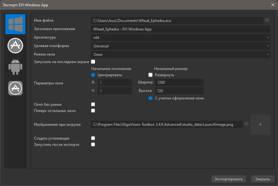 Чтобы экспортировать проект в виде Windows-приложения в формате .exe откройте диалог экспорта и в панели слева выберите Windows в качестве целевой платформы. Откроется список параметров будущего приложения.