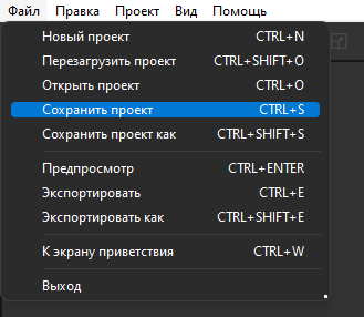В главном меню выбрать пункт Файл > Сохранить проект или воспользоваться сочетанием горячих клавиш <CTRL> + S.