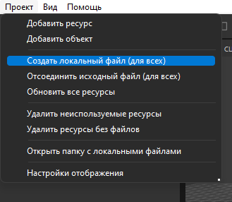 Функция Создать локальные файлы позволяет создать локальные файлы всех ресурсов проекта путем их копирования с исходных.