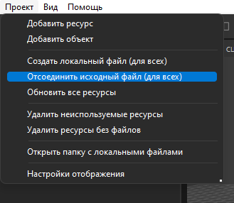 Данная функция позволяет программе забыть все пути к исходным файлам, расположенным в разных местах файловой системы и переключиться на использование только локальных, которые были скопированы в папку с ресурсами проекта. В таком случае проект можно легко перенести на другой ПК без потери ресурсов.