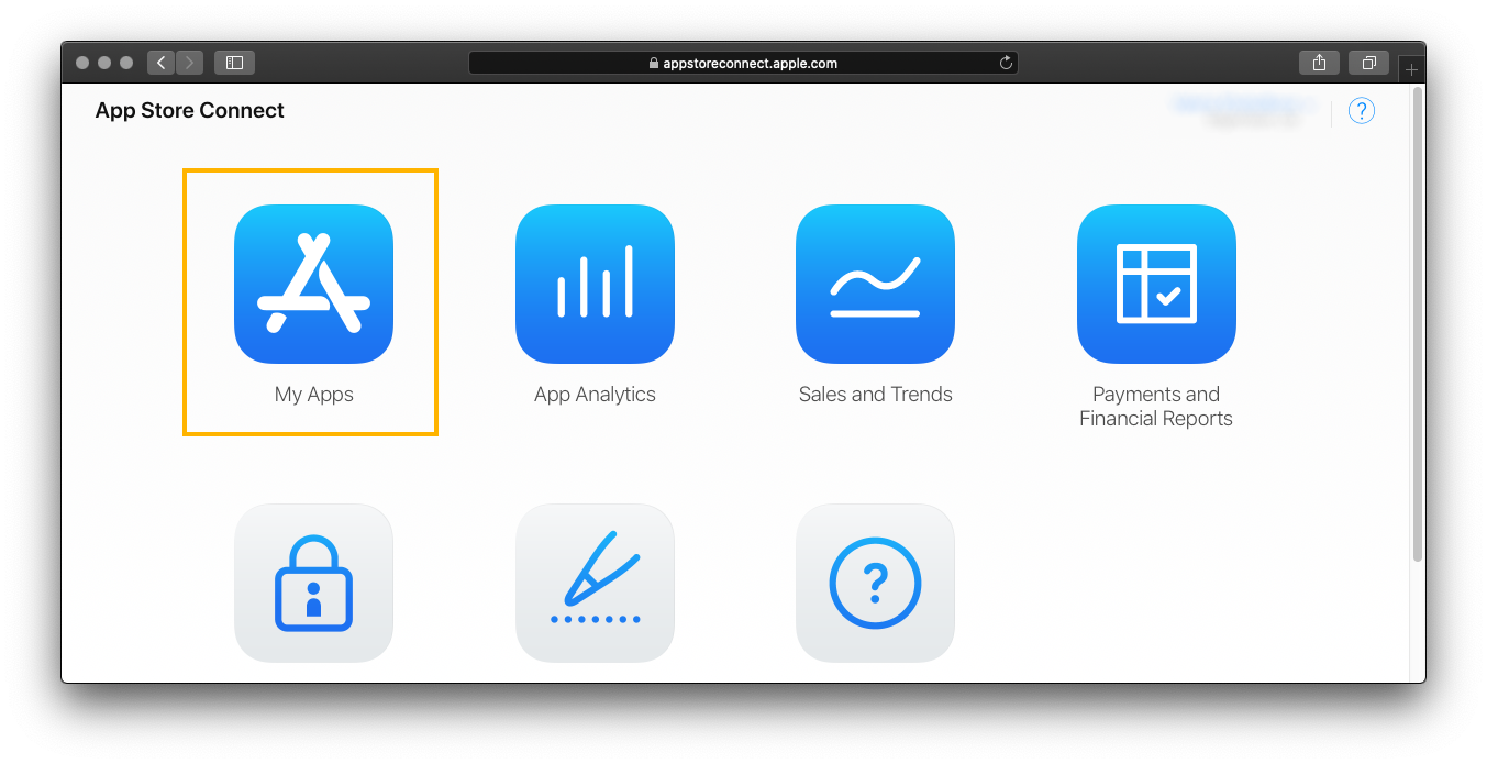 Для загрузки iOS-приложения в AppStore необходимо создать запись в App Store Connect. Для этого перейдите в личный кабинет разработчика и в меню слева выберите App Store Connect. После перехода на главую страницу AppStore Connect, выберите вкладку My Apps. Далее в верхнем углу нажмите кнопку +, выберите New app и следуйте дальнейшим инструкциям на сайте.