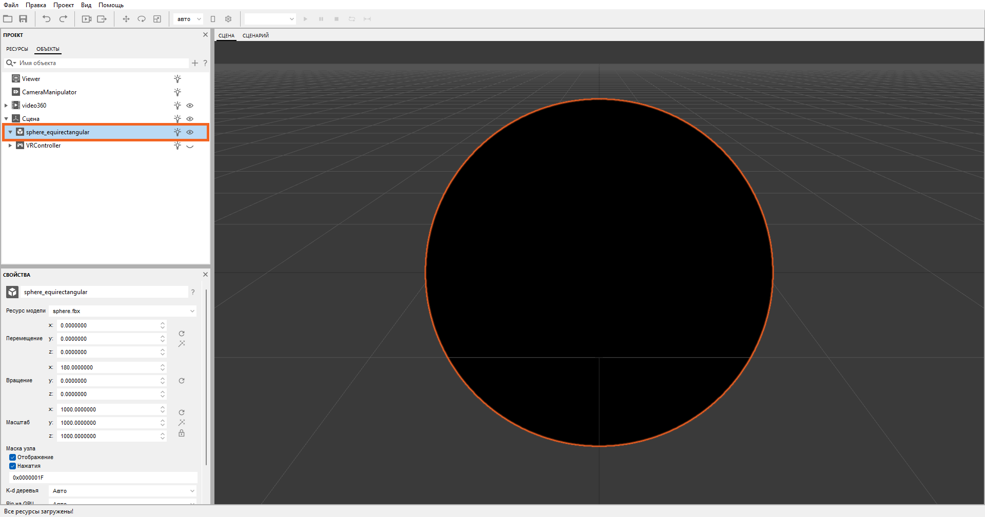 В проекте представлена базовая сцена со сферой, которая используется в качестве объекта - основы. Видео формата 360° или фотопанорамы будут «накладываться» на внутреннюю часть сферы для реалистичного опыта погружения.