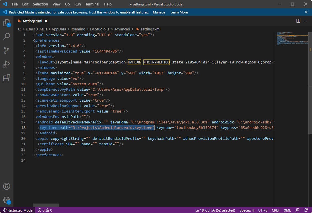 Найдите параметр <keystore path> (18 строка), где указан текущий путь к расположению файлов android.keystore. Замените путь к файлу на необходимый: в нашем примере это будет D:/Projects/Android/android.keystore. Сохраните изменения в файле.